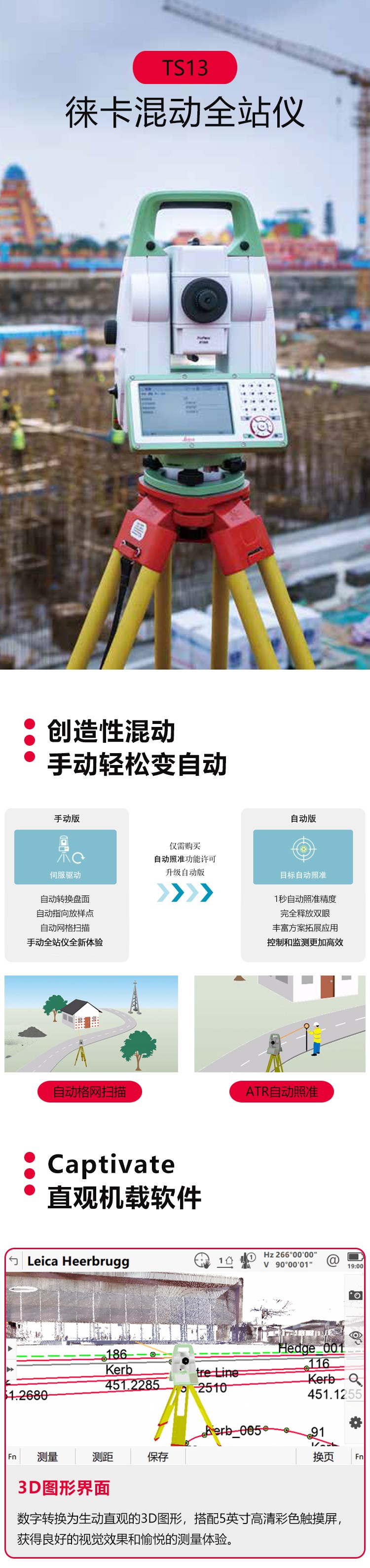 徠卡TS13自動型全站儀使用了成熟的Captivate機載系統,搭配5英寸彩色觸屏,不僅擁有流暢的3D界面設計,提供豐富的圖形化引導和流程化的菜單設計,還擁有長期以來研發的多種本地化程序,貼合國內測量規范和用戶需求。